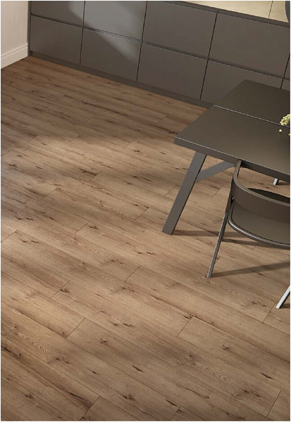 Толщина ламелей – 8мм. Пол получается прочным, устойчивым к весовым нагрузкам. Ламинат не прогибается под ножками тяжелой мебели, на нем не появляется вмятин и трещин от падения предметов.