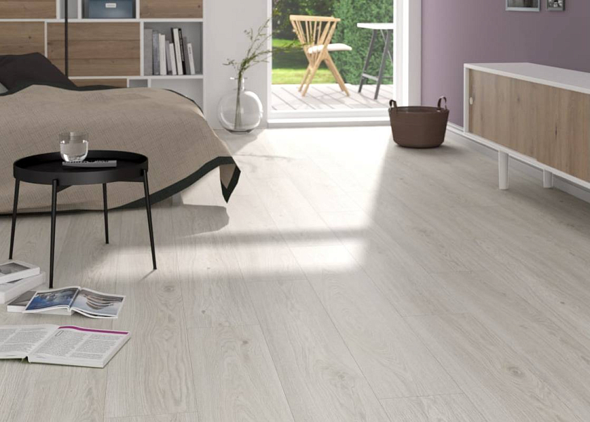 Толщина ламелей – 8мм. Пол получается прочным, устойчивым к весовым нагрузкам. Ламинат не прогибается под ножками тяжелой мебели, на нем не появляется вмятин и трещин от падения предметов.