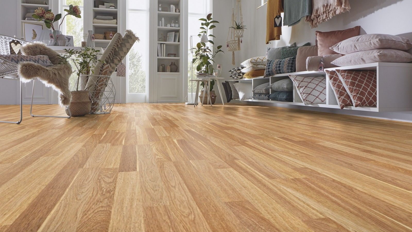 Толщина ламелей – 8мм. Пол получается прочным, устойчивым к весовым нагрузкам. Ламинат не прогибается под ножками тяжелой мебели, на нем не появляется вмятин и трещин от падения предметов.