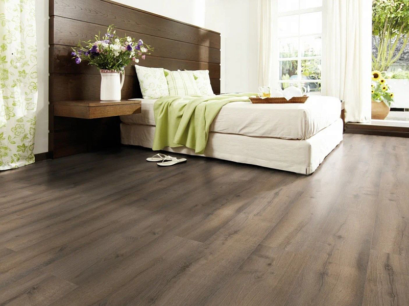 Толщина ламелей – 12мм. Пол получается прочным, устойчивым к весовым нагрузкам. Ламинат не прогибается под ножками тяжелой мебели, на нем не появляется вмятин и трещин от падения предметов.