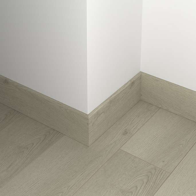 Монтаж плинтусных плашек прост. Все элементы соединяются с помощью замков, так что сбор обрамления не займет много времени. На нижней поверхности плашек есть выемки, в которые можно уложить провода, тонкие трубы. Так можно скрыть коммуникации, проходящие вдоль стен.