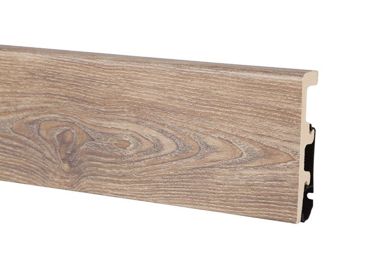 Монтаж плинтусных плашек прост. Все элементы соединяются с помощью замков, так что сбор обрамления не займет много времени. На нижней поверхности плашек есть выемки, в которые можно уложить провода, тонкие трубы. Так можно скрыть коммуникации, проходящие вдоль стен.