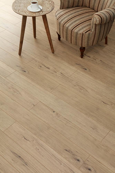 Толщина ламелей – 10мм. Пол получается прочным, устойчивым к весовым нагрузкам. Ламинат не прогибается под ножками тяжелой мебели, на нем не появляется вмятин и трещин от падения предметов.