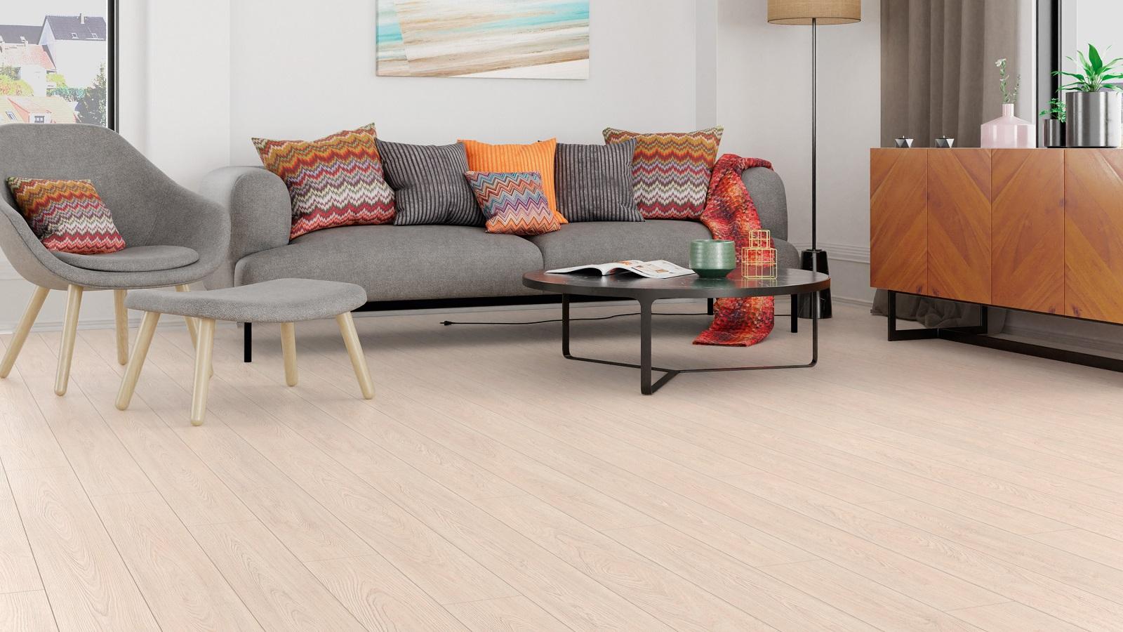 Толщина ламелей – 10мм. Пол получается прочным, устойчивым к весовым нагрузкам. Ламинат не прогибается под ножками тяжелой мебели, на нем не появляется вмятин и трещин от падения предметов.