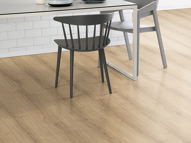 Толщина ламелей – 8мм. Пол получается прочным, устойчивым к весовым нагрузкам. Ламинат не прогибается под ножками тяжелой мебели, на нем не появляется вмятин и трещин от падения предметов.
