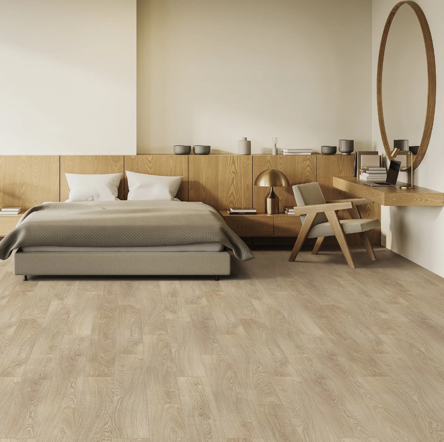 Толщина ламелей – 8мм. Пол получается прочным, устойчивым к весовым нагрузкам. Ламинат не прогибается под ножками тяжелой мебели, на нем не появляется вмятин и трещин от падения предметов.