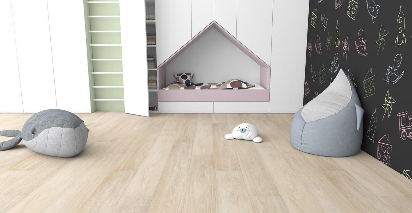 Толщина ламелей – 8мм. Пол получается прочным, устойчивым к весовым нагрузкам. Ламинат не прогибается под ножками тяжелой мебели, на нем не появляется вмятин и трещин от падения предметов.