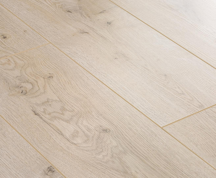 Толщина ламелей – 8мм. Пол получается прочным, устойчивым к весовым нагрузкам. Ламинат не прогибается под ножками тяжелой мебели, на нем не появляется вмятин и трещин от падения предметов.