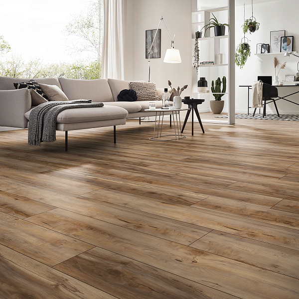Толщина ламелей – 8мм. Пол получается прочным, устойчивым к весовым нагрузкам. Ламинат не прогибается под ножками тяжелой мебели, на нем не появляется вмятин и трещин от падения предметов.