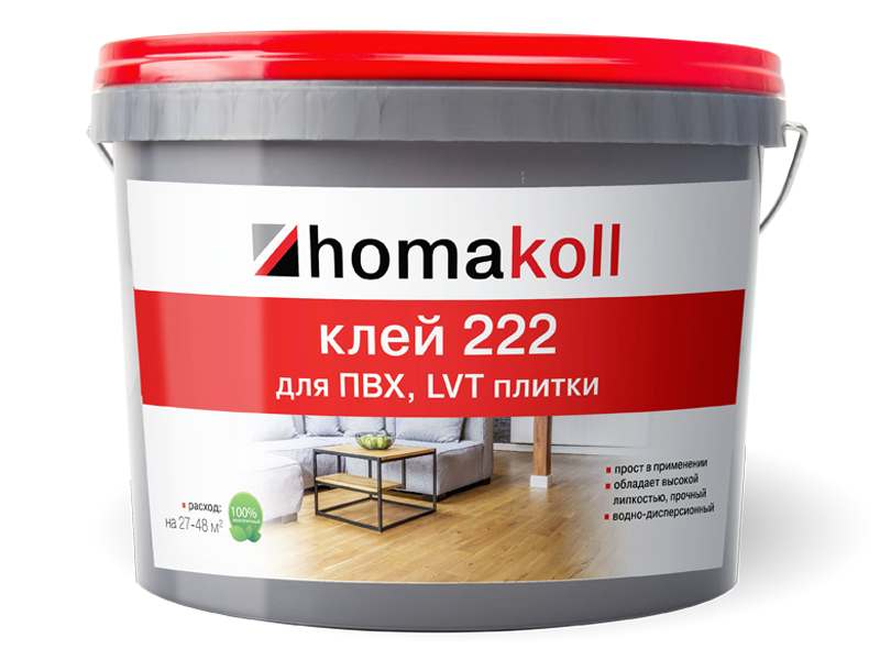 КлейКлей для ПВХ плитки водно-дисперсионный homakoll 222 1кг соответствует стандартам международной экологической безопасности и подходит для жилых помещений любого назначения. Внешний вид полностью совпадает с фотографией и при использовании подходящих моющих средств со временем не теряет своих качеств, не тускнеет. Удобное в монтаже, прочное покрытие сохраняет геометрию укладки в течение всего срока эксплуатации, не рассыхается, не образует зазоры в местах стыков.
