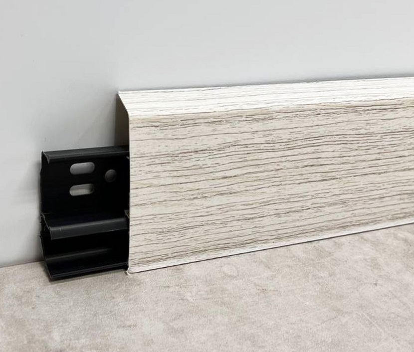Монтаж плинтусных плашек прост. Все элементы соединяются с помощью замков, так что сбор обрамления не займет много времени. На нижней поверхности плашек есть выемки, в которые можно уложить провода, тонкие трубы. Так можно скрыть коммуникации, проходящие вдоль стен.