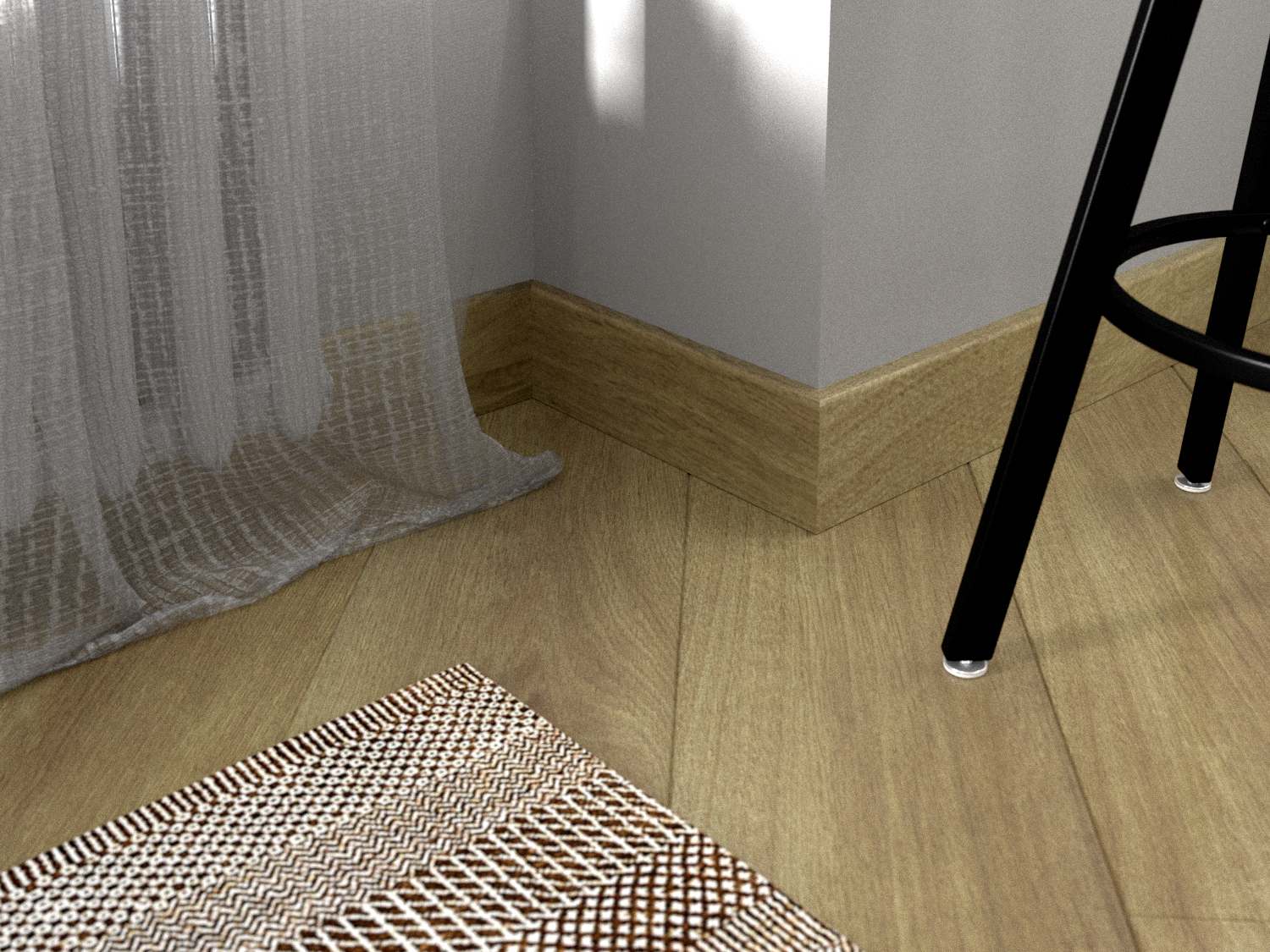 Высота планок – 60мм. Ее достаточно, чтобы скрыть все технические зазоры – между напольным полотном и стеной, между нижней настенной панелью и полом. Нижний край настенной панели можно завести под плинтус, который станет своеобразной рамкой для оформления. Предварительного выравнивания стыка пола и стен не требуется.